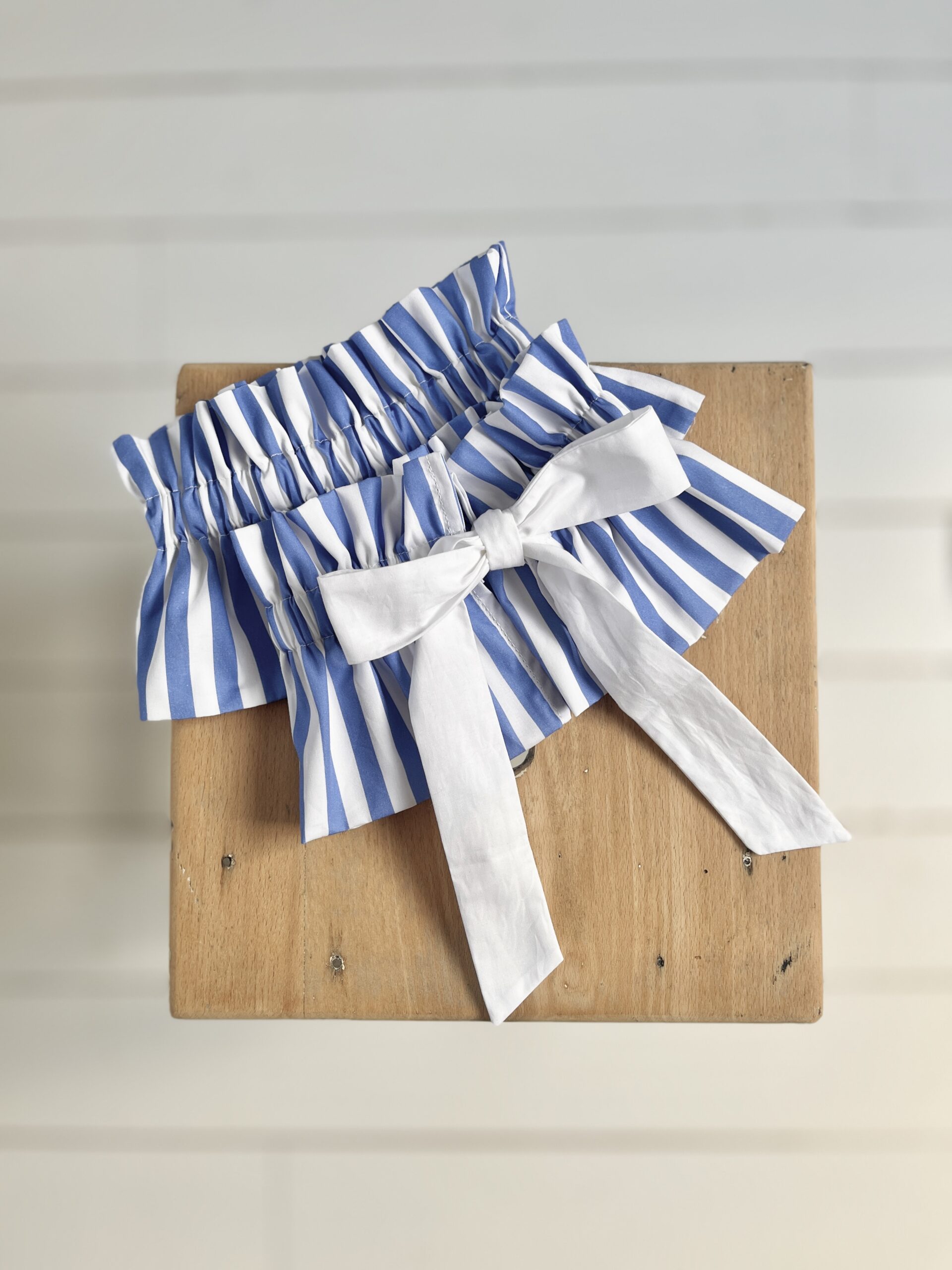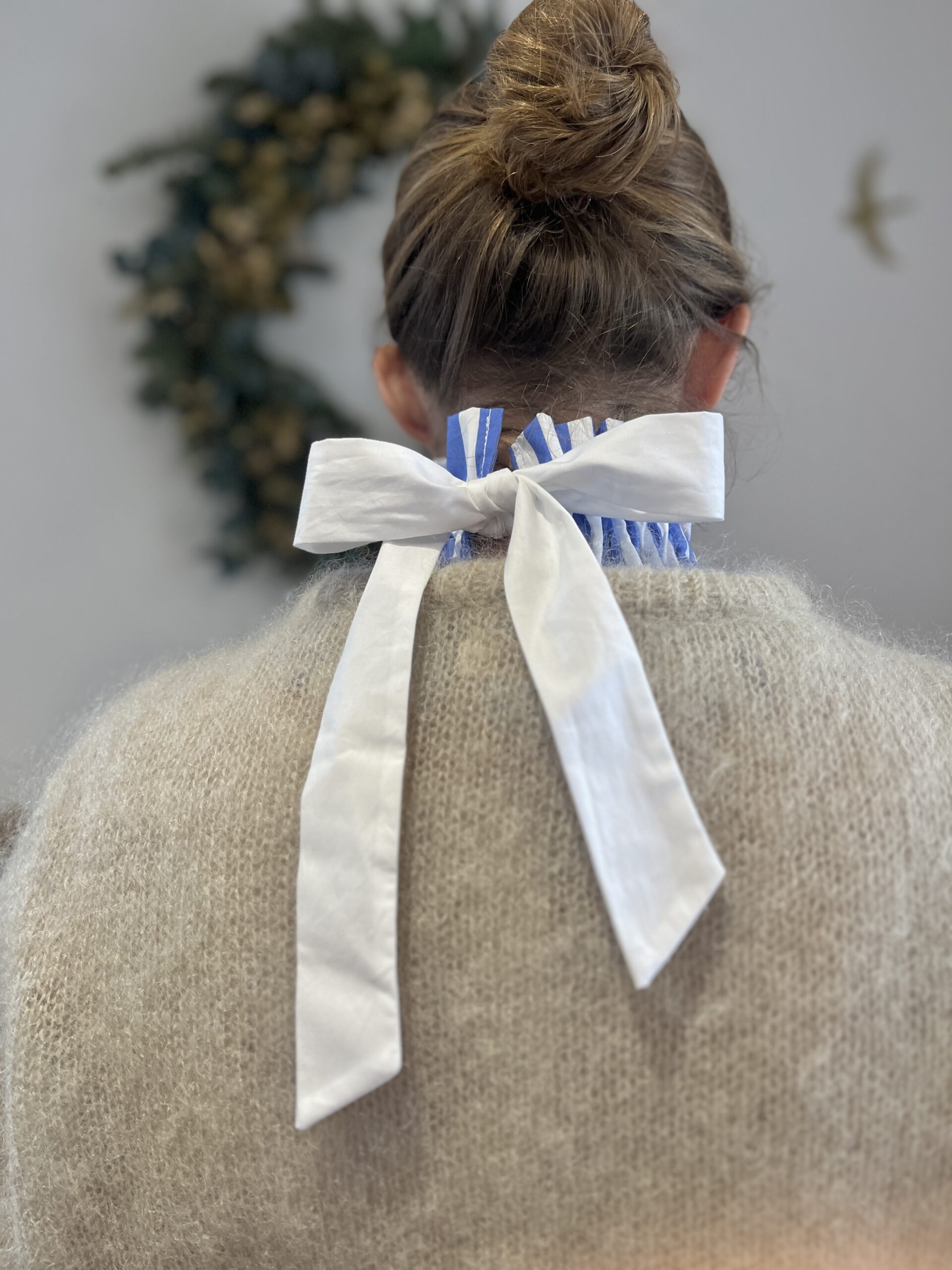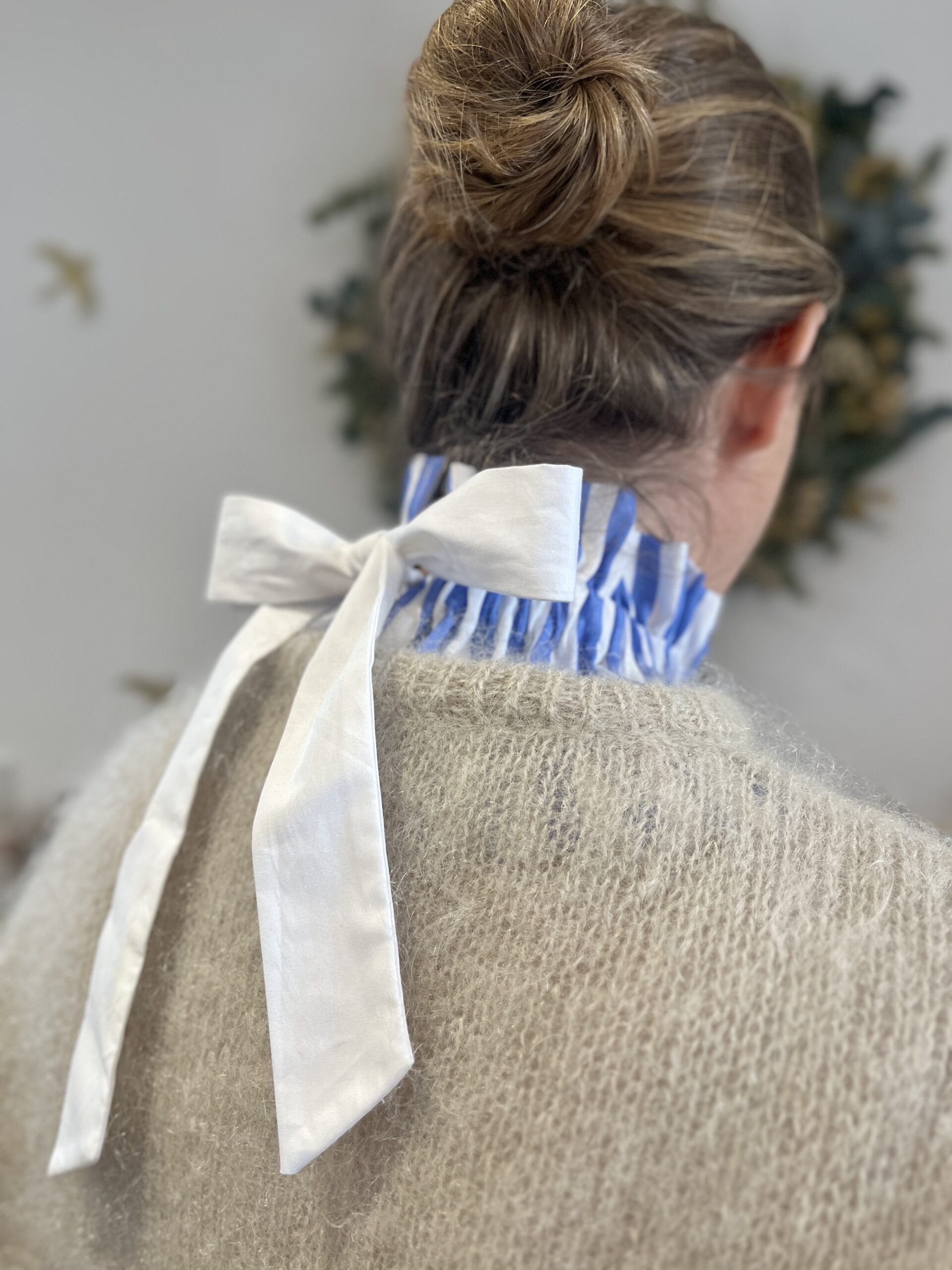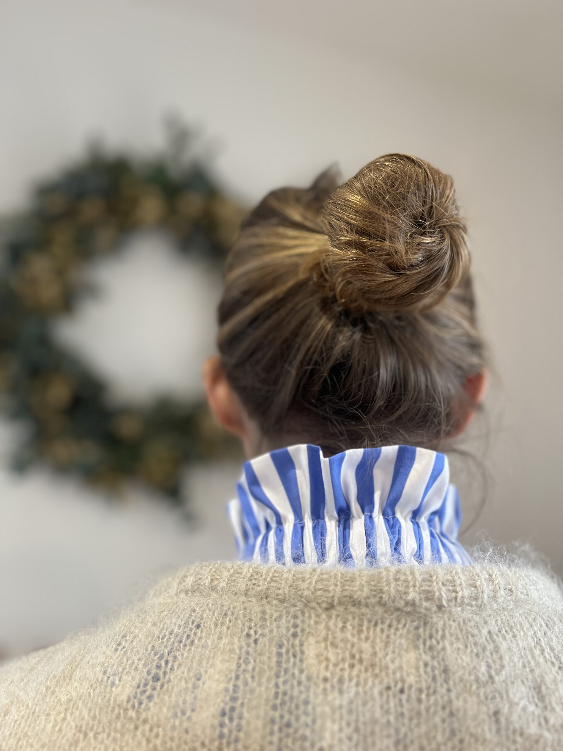 Hortense le col volanté à gros noeud pour les mum’s larges rayures bleues