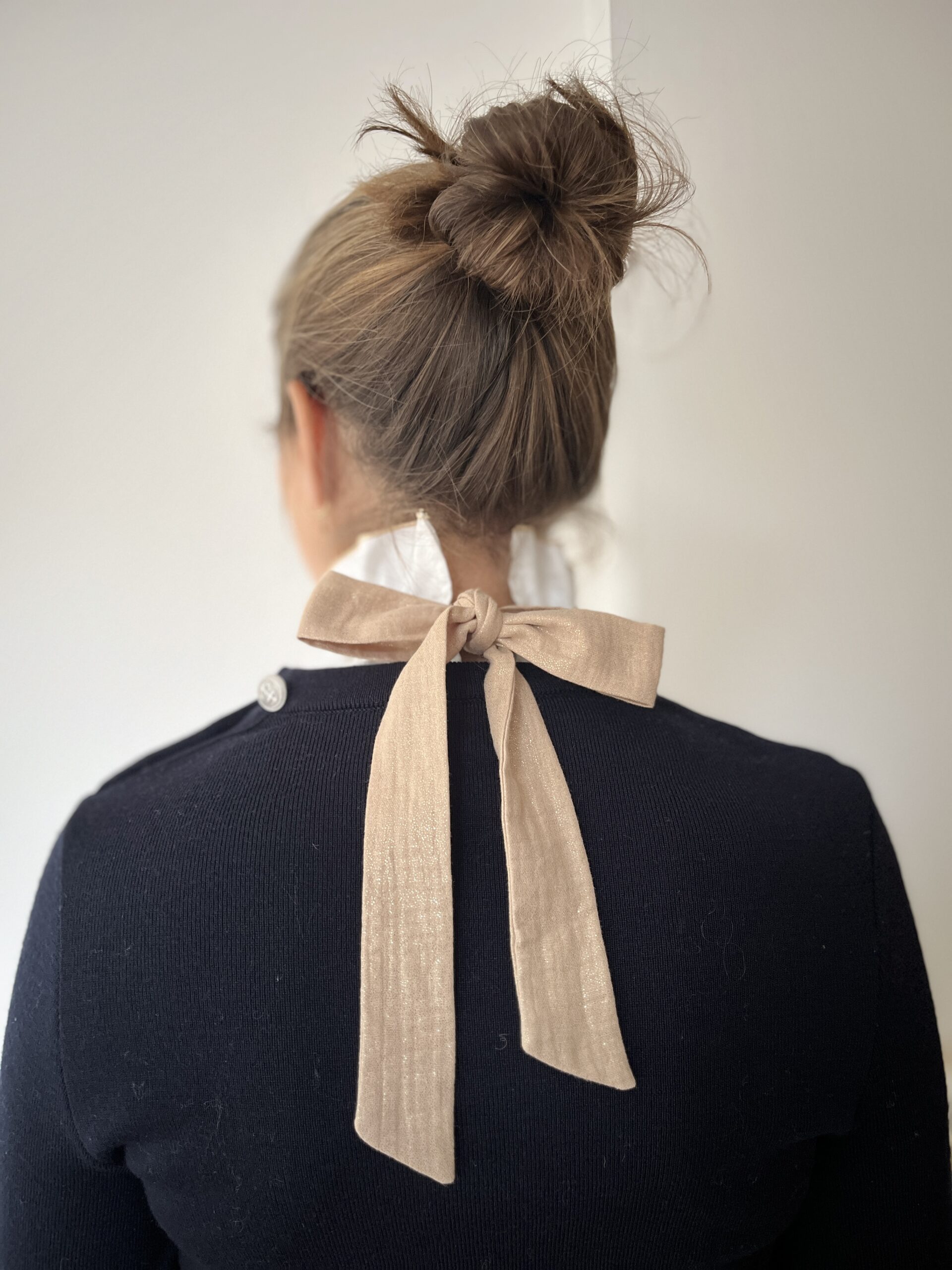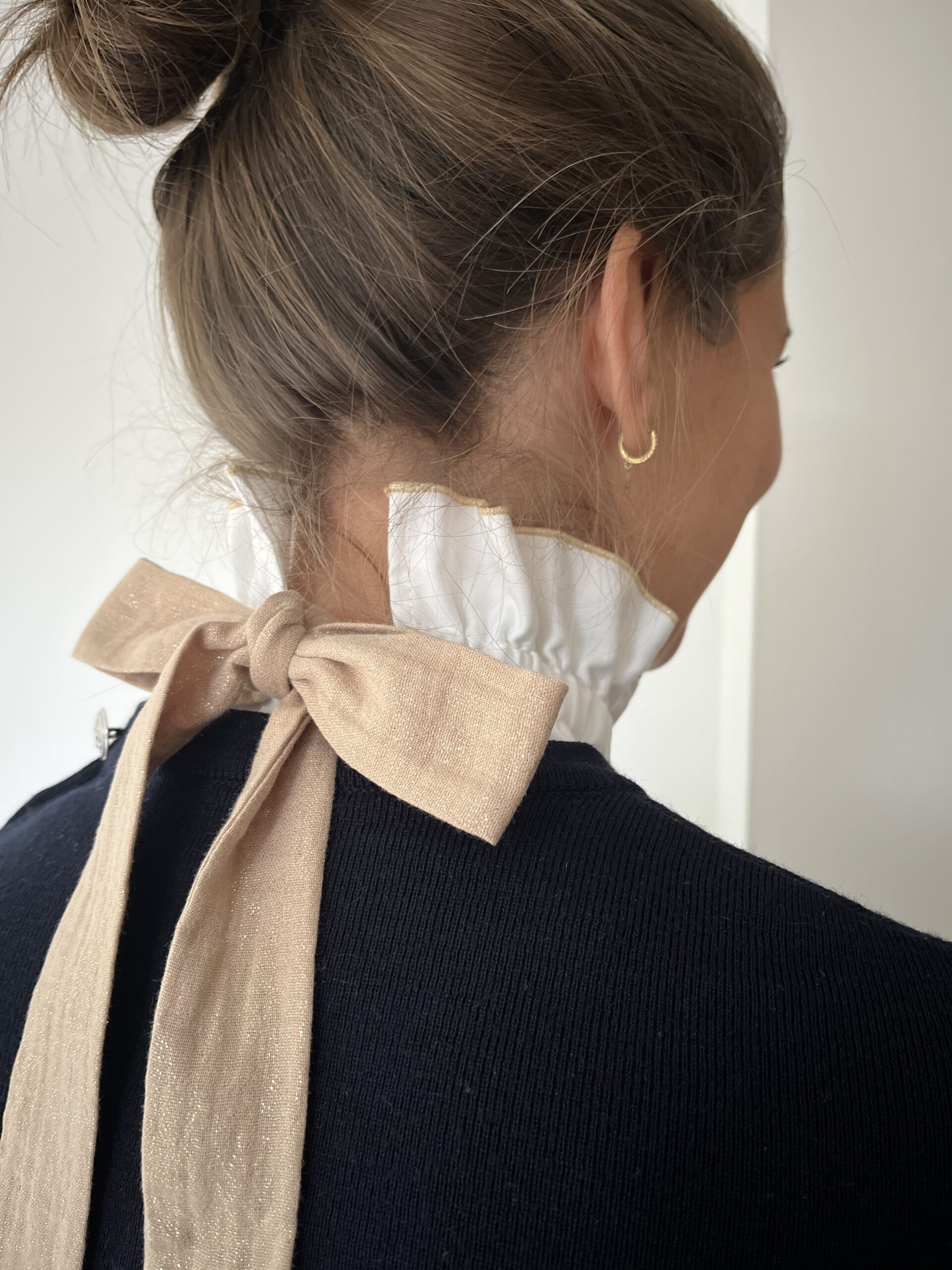 On adore son tissu: une popeline de coton surfilée en doré et un gros noeud en double gaze dorée qui a une belle tenue. Bref, notre col Hortense a vraiment tout pour plaire !