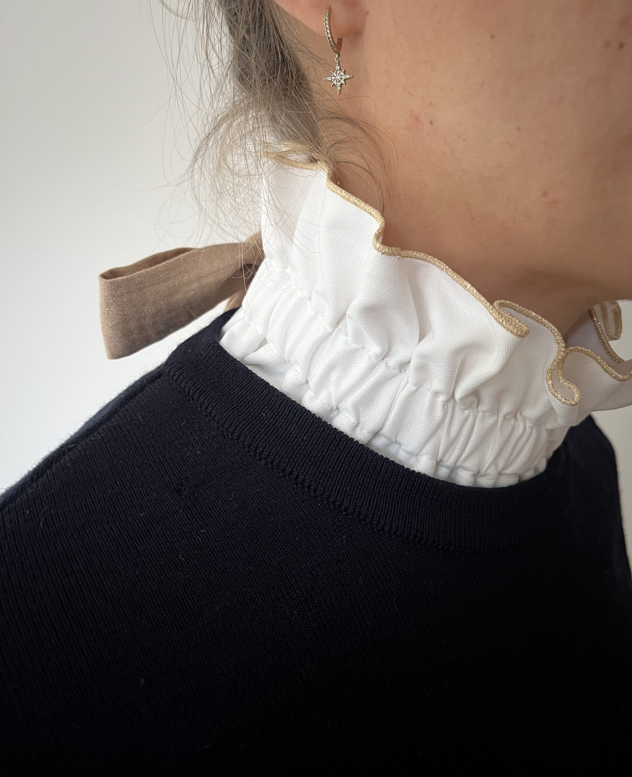 C’est le nouveau must have ! L’accessoire qu’il faut à toutes les mamans : le col volanté Hortense bien sûr ! Il se ferme par deux pants qui peuvent former un gros noeud . Il se met sous ou sur un pull, un gilet, voilà comment avoir l’effet d’un joli chemisier en un claquement de doigts!