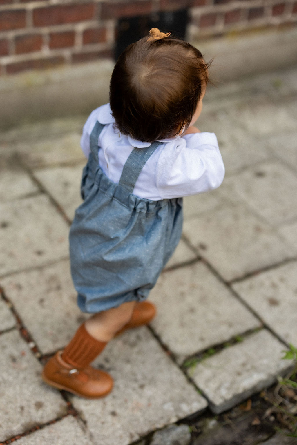 Clovis, la barboteuse rétro à larges bretelles en chmabray de coton bleu chiné