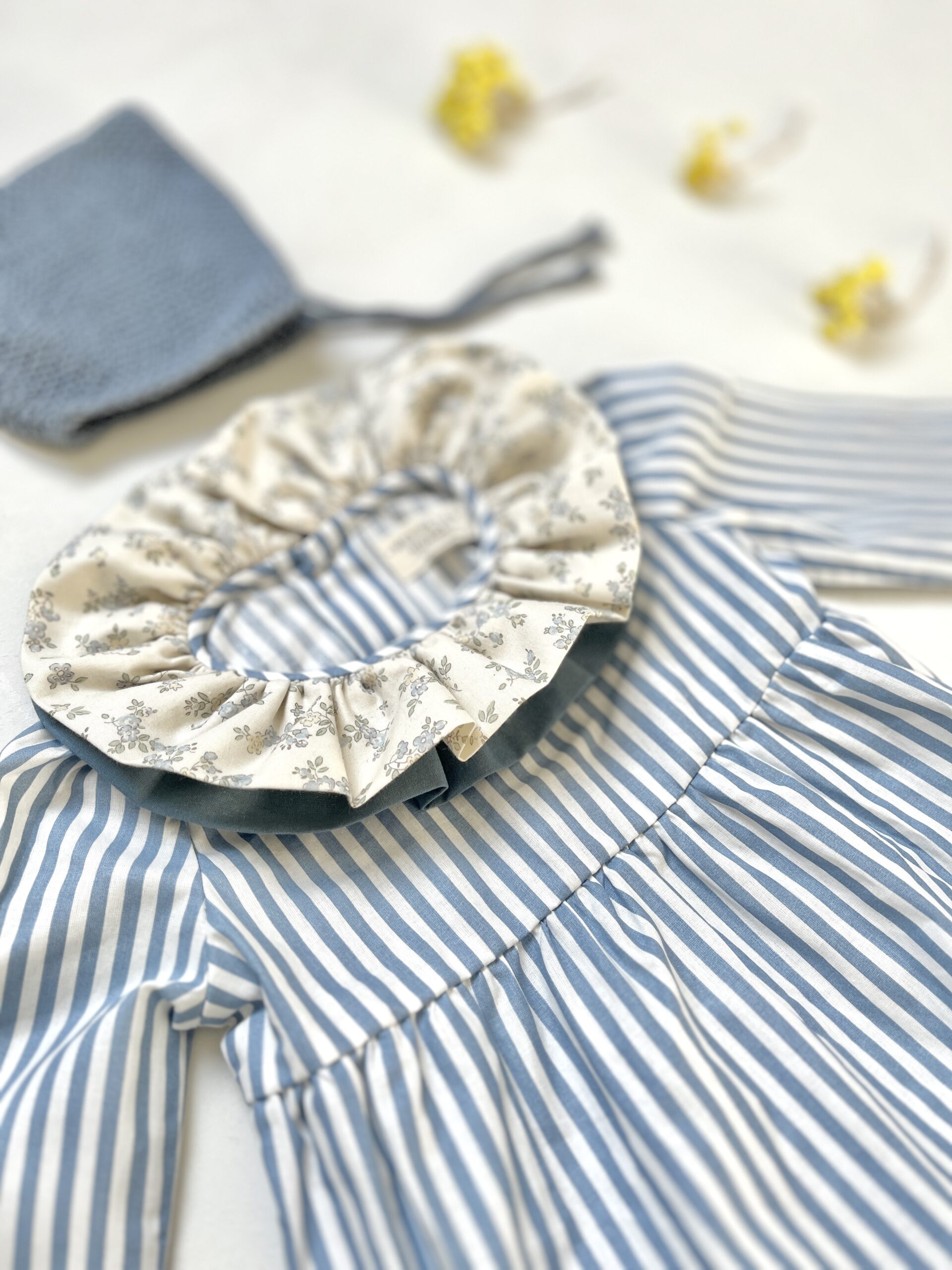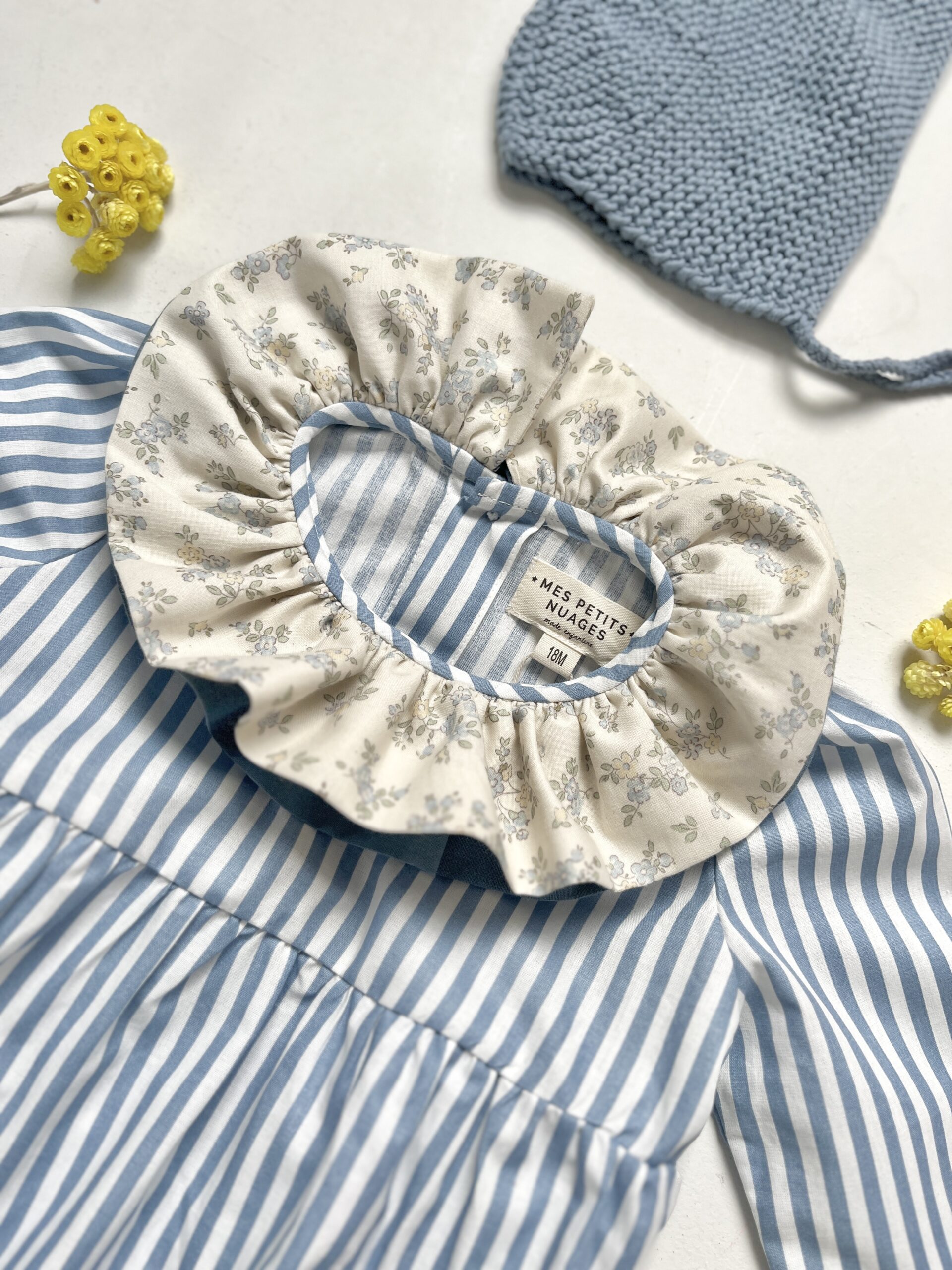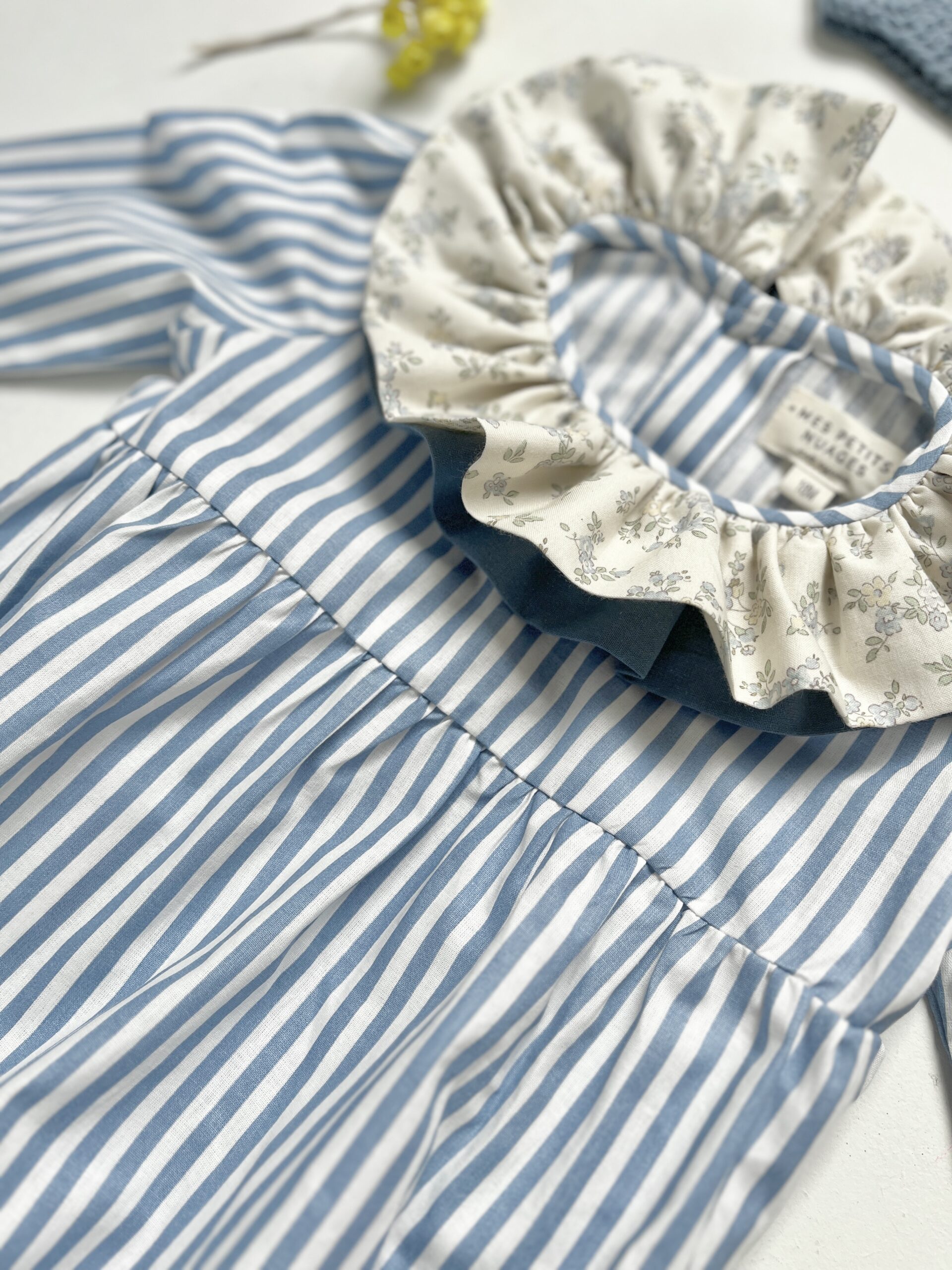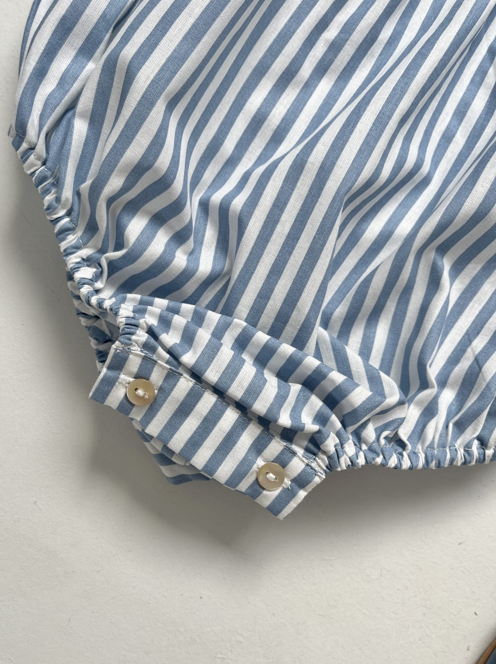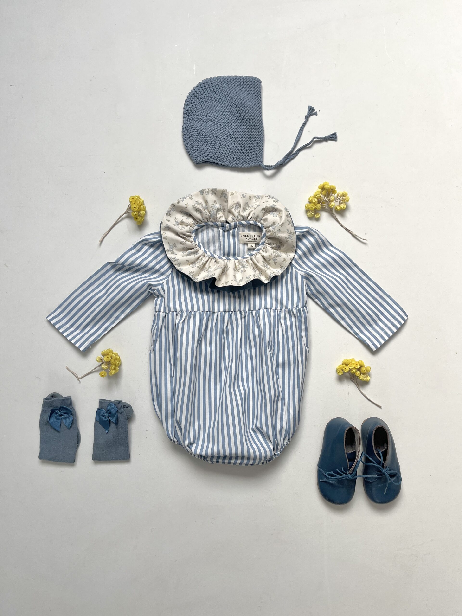 La barboteuse à double col volanté Pia rayée bleu