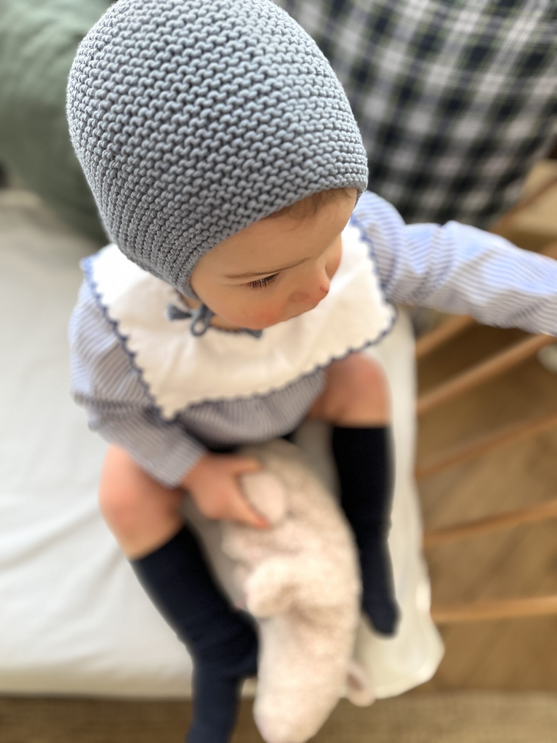 La touche Mes Petits Nuages : ajouter un petit béguin tricoté Clotaire pour un petit look rétro