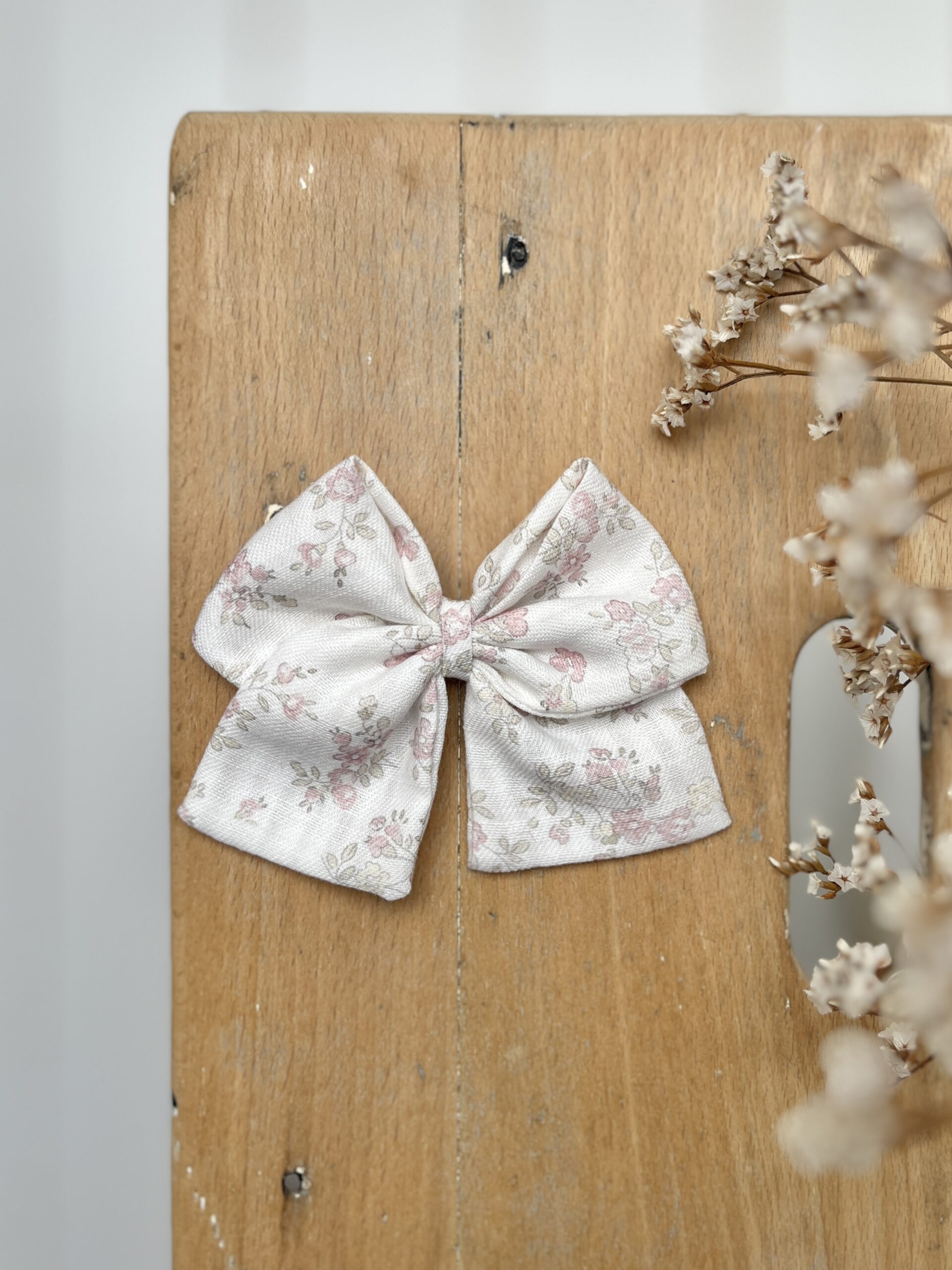 La barrette à gros nœud Brunette fleurs roses sur fond écru