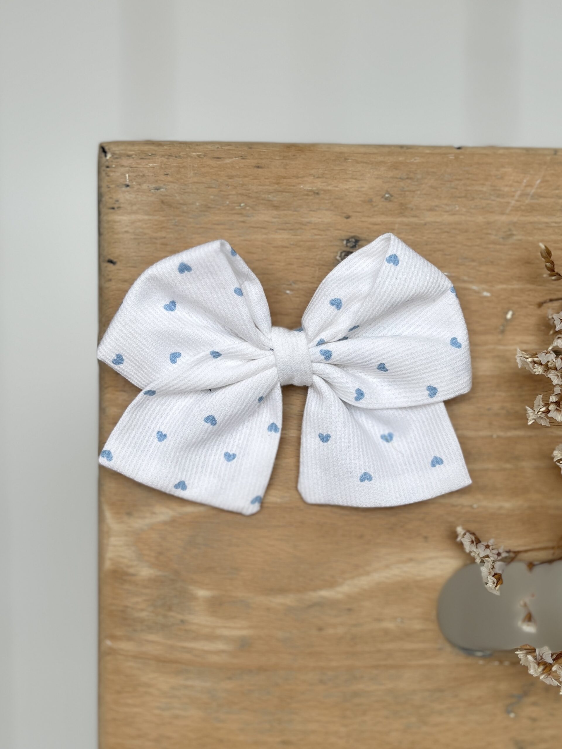 La barrette à gros nœud Brunette piqué blanc et coeurs bleus
