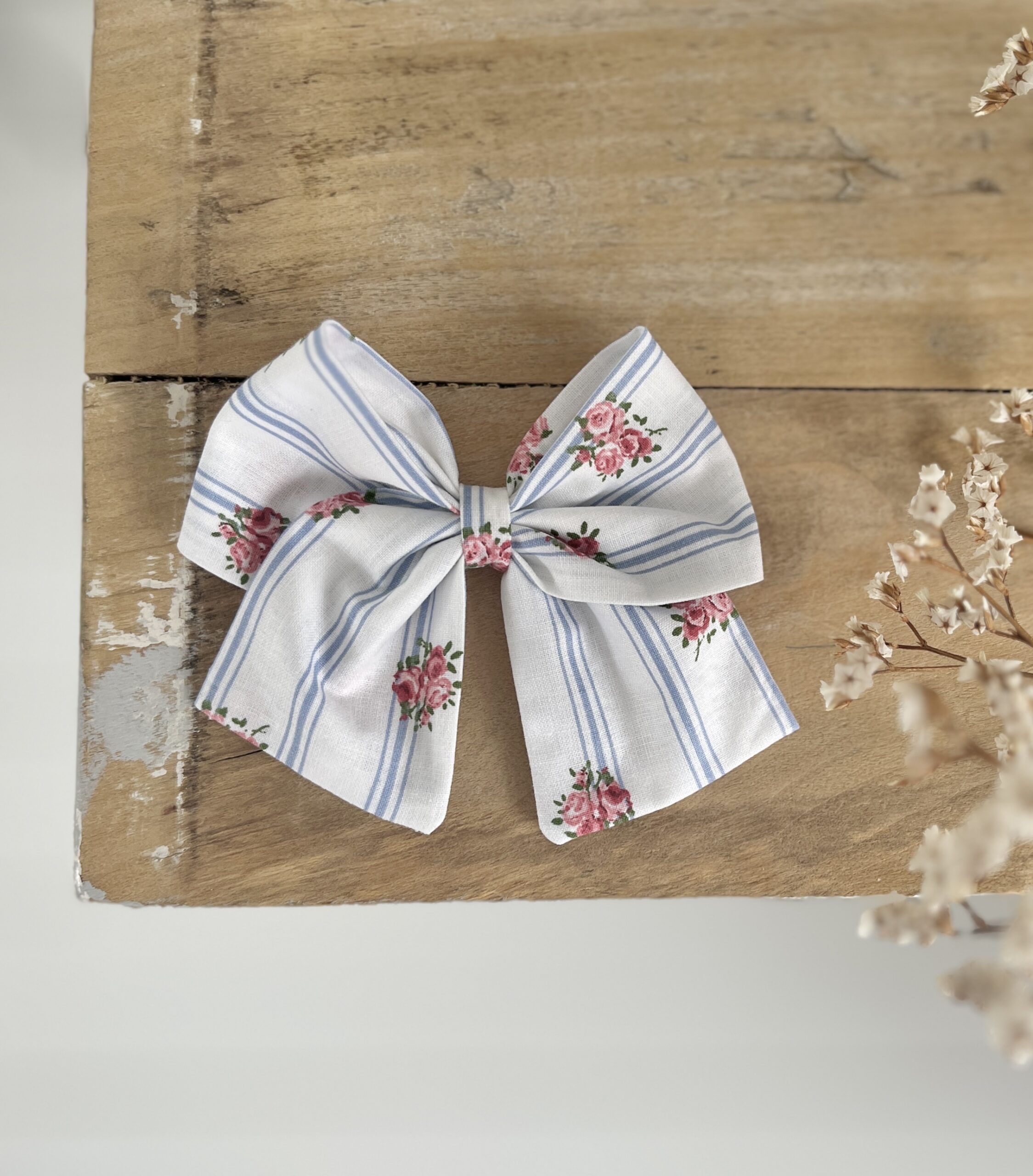 La barrette à gros nœud Brunette fleurs sur rayures bleues