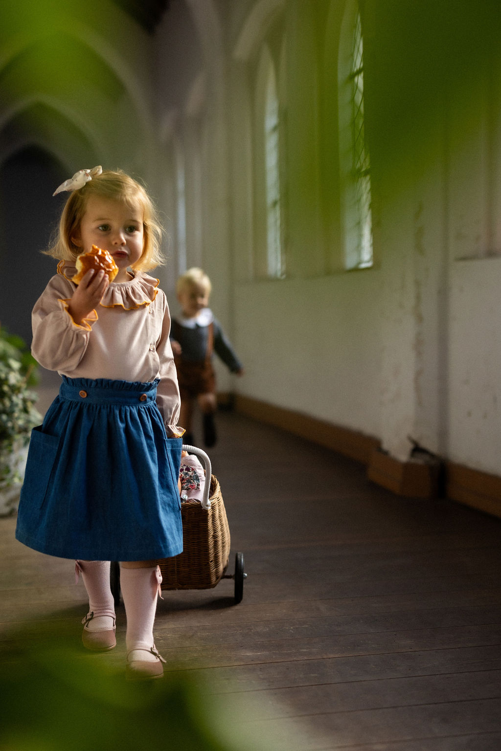 Eléonore, la jolie blouse qui fait son entrée dans le dressing de nos petites filles. En velours milleraies nude, sa patte de boutonnage côté, son col volanté festonné et son bas de manche brodé en fil doré, on est totalement séduit par les détails délicats de cette pièce.