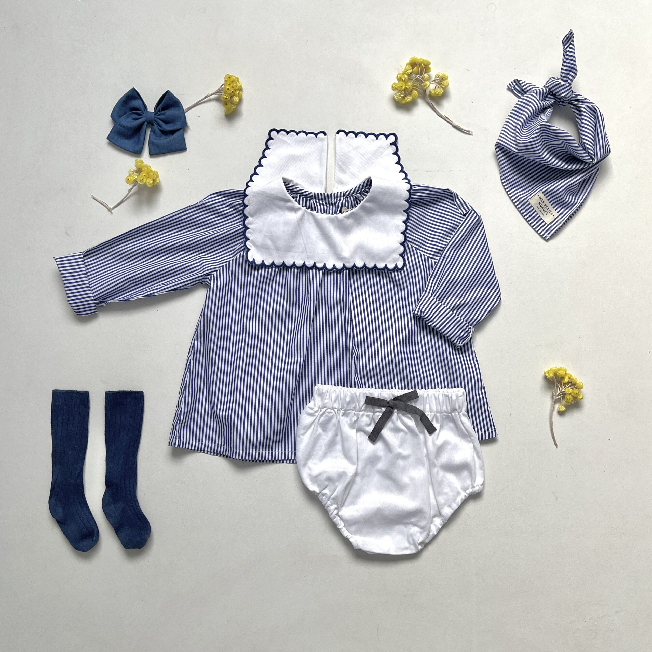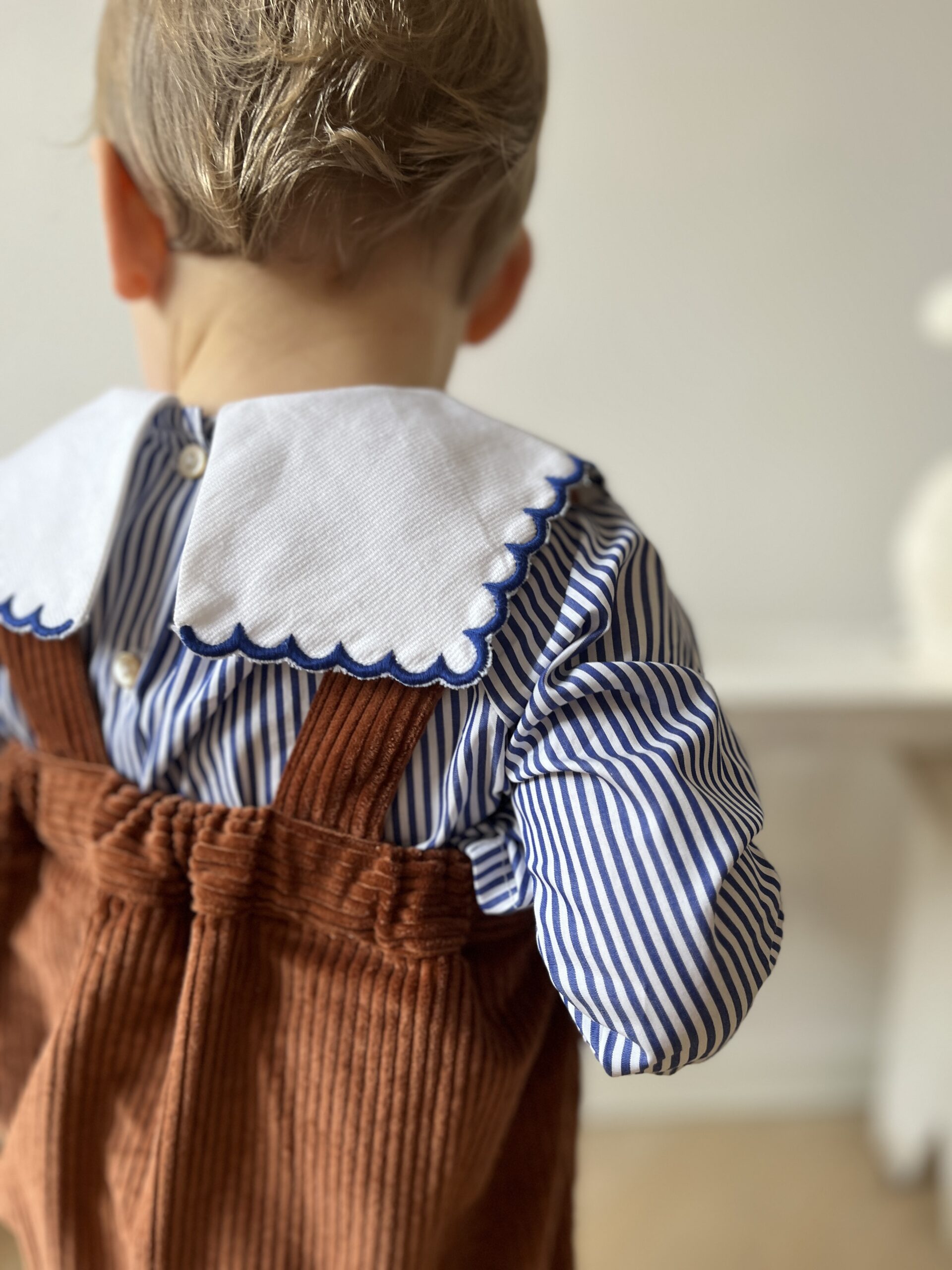 Petit Beurre est une blouse à col carré festonné, qui convient parfaitement aux petites filles ou aux petits garçons quand ils sont petits. Son tissu intemporel à fines rayures bleues, sa forme froncée en haut et ses boutons en nacre en font une pièce ravissante.