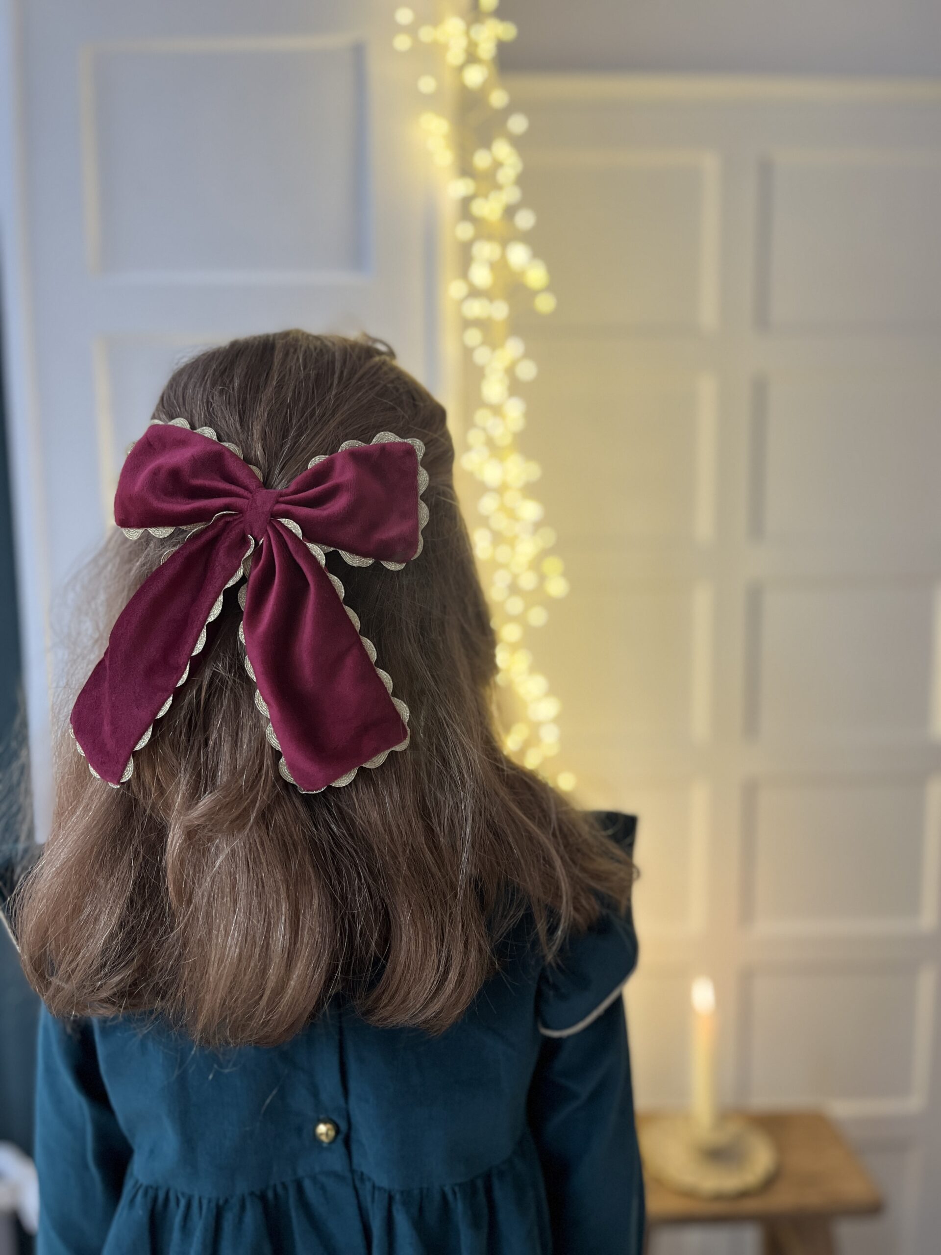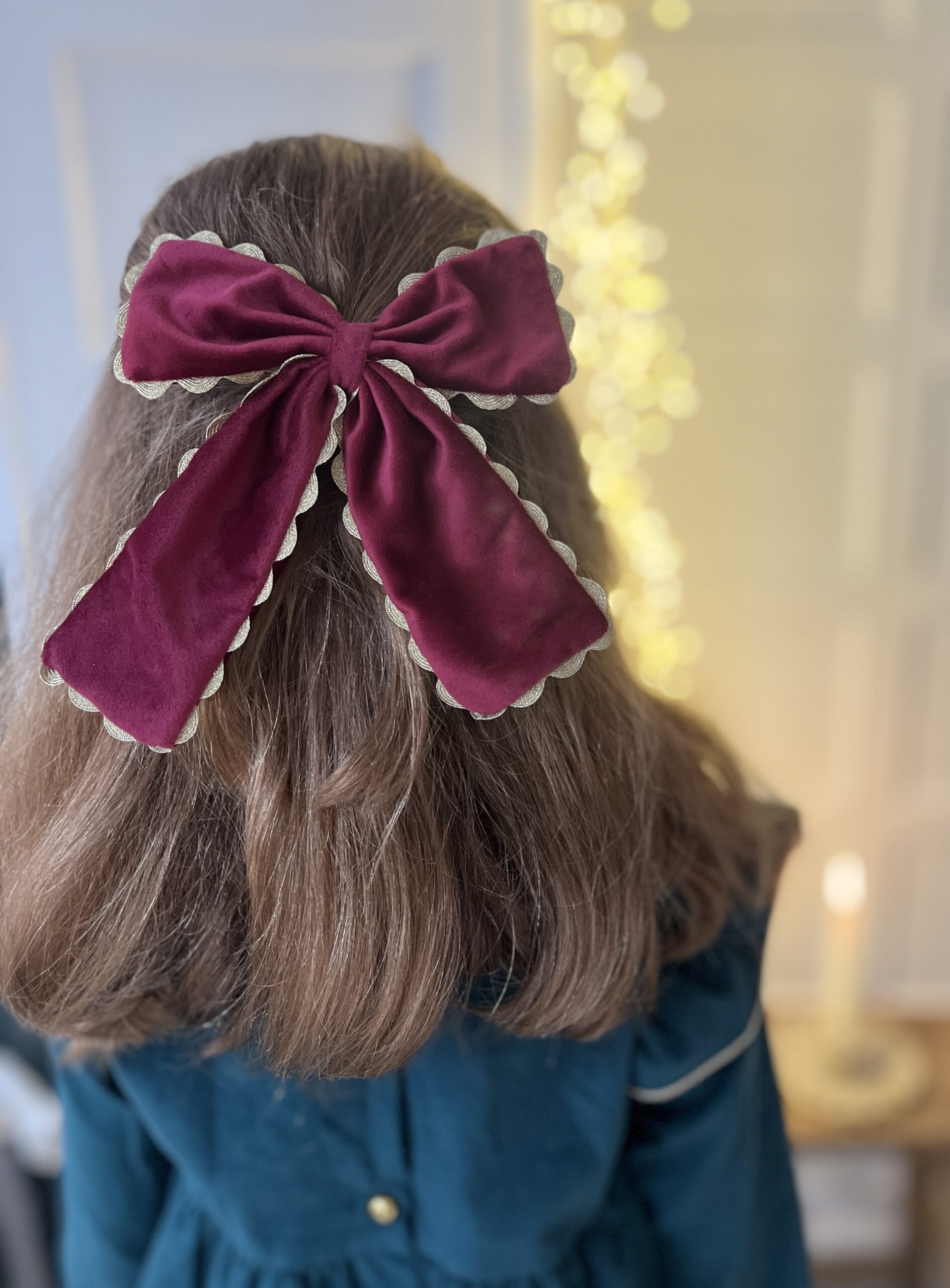Noël: La maxi barrette à gros nœud Brunette velours bordeaux et or