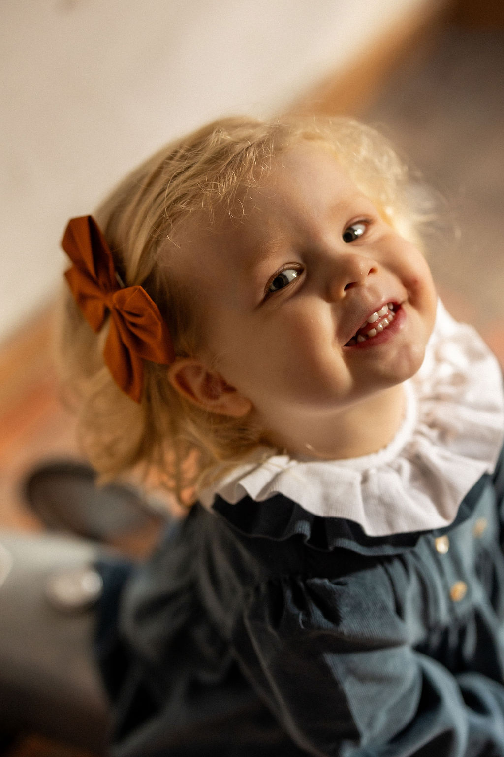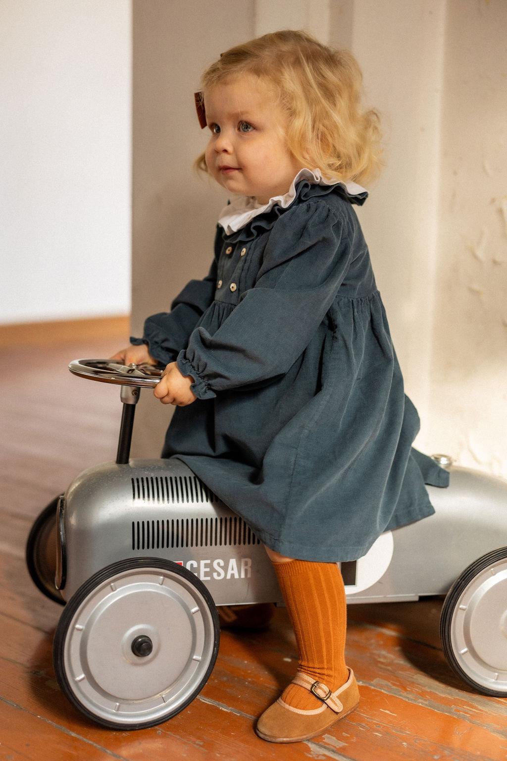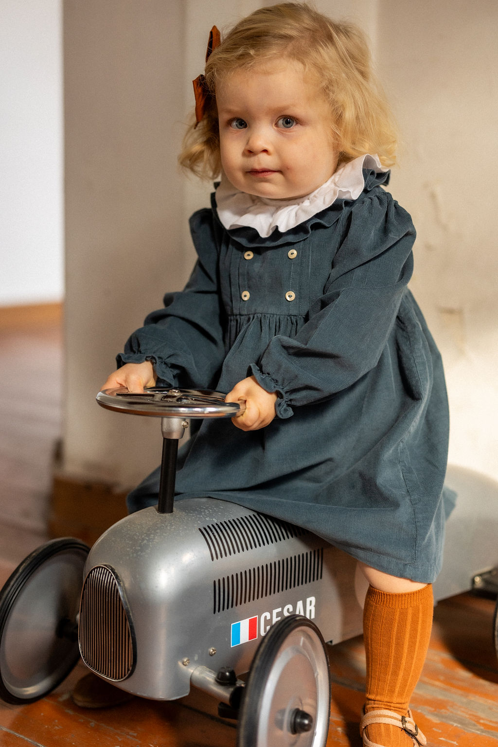 Double col volanté , manches élastiquées, boutons en nacre et longueur dessus de genou font le charme de notre robe Suzanne. Cette saison, Suzanne se revêt d’un joli velours milleraies bleu gris. Confortable et intemporelle, on parie que vos filles voudront la porter tous les jours ! Avec des chaussettes hautes, Suzanne se porte toute l’année. Qui a dit qu’il n’y avait que le dimanche pour être chic et jolie ?
