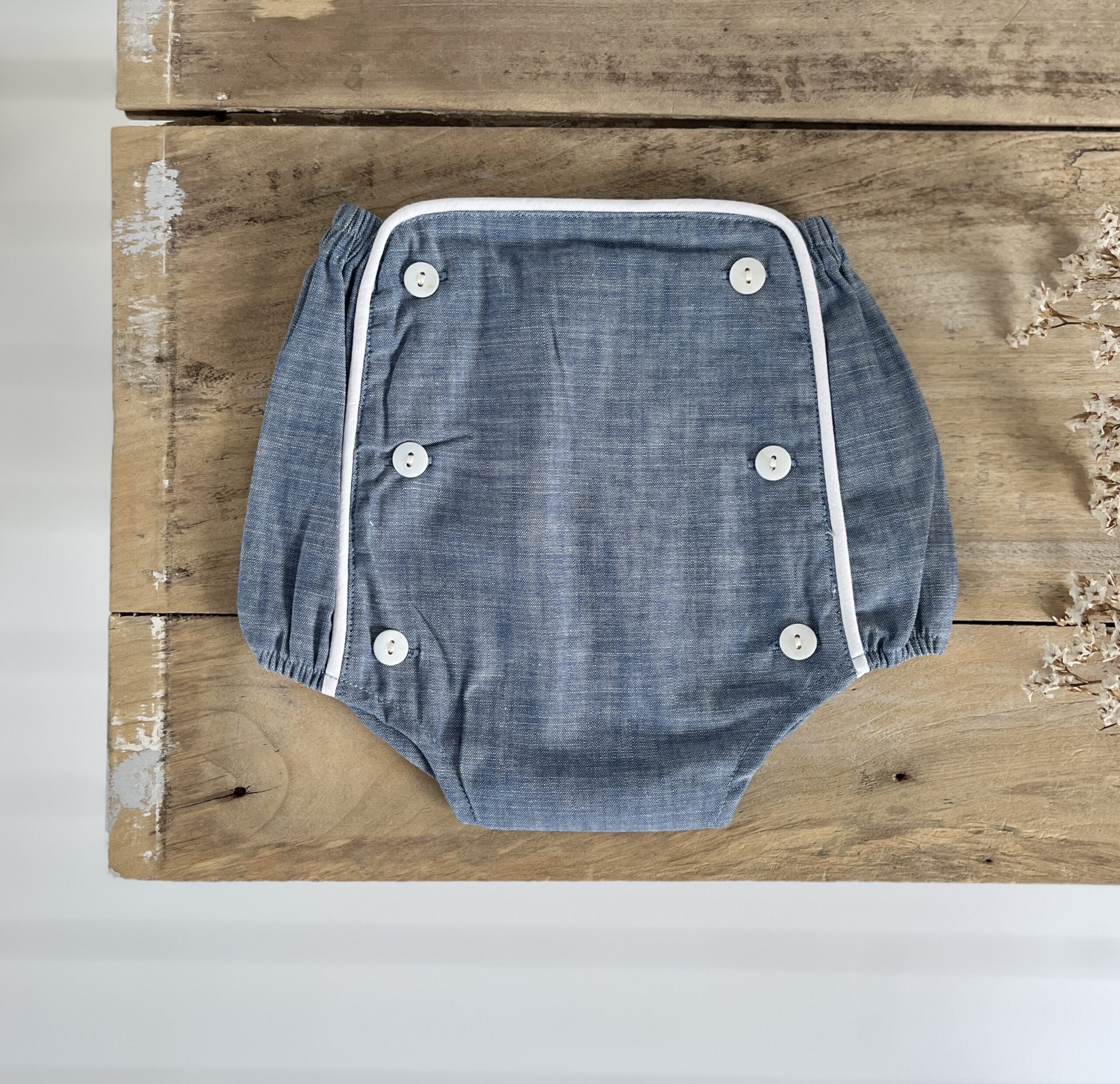 Quelle allure ce bloomer Octave ! Un short parfait pour mettre en valeur les cuissots de nos bébés ! Chic dans sa teinte bleu denim avec son passepoil blanc, on l’assorti à toutes les blouses de la collection . Avec sa taille élastiquée, il est très pratique à enfiler à bébé. Ses 6 boutons en nacre lui donnent un look parfait.