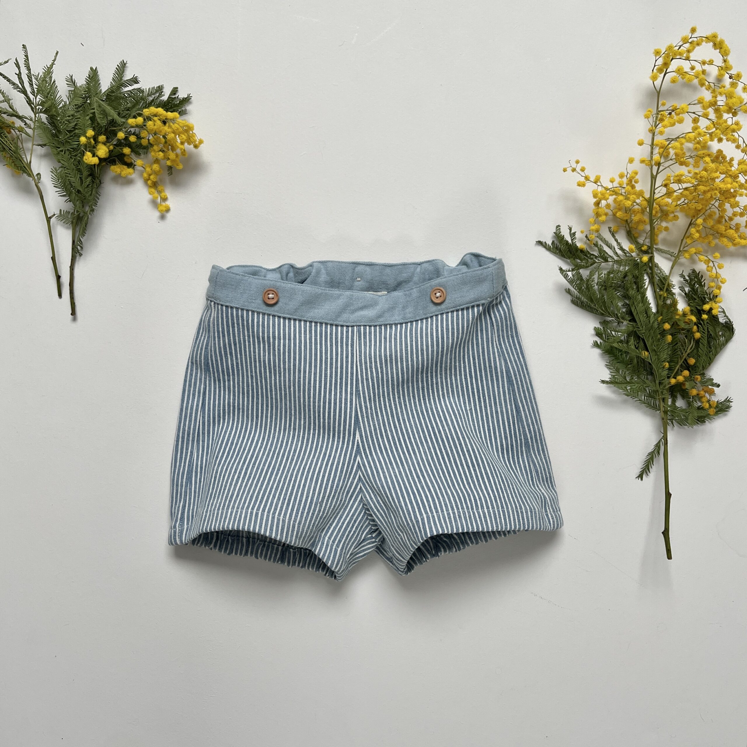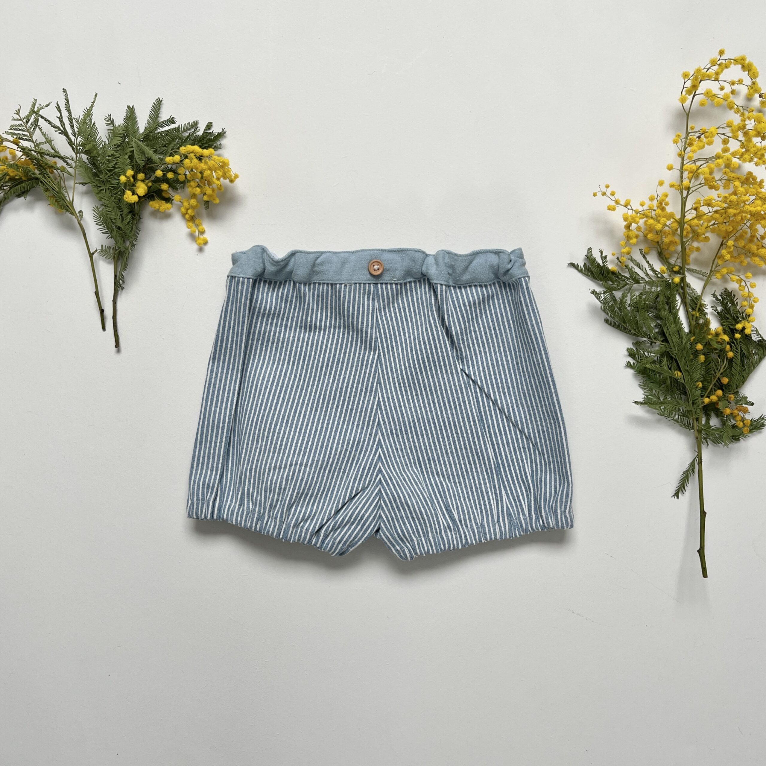 Joseph est un petit short court en denim rayé bleu ciel, avec un tissu type « Oshkosh ». Il est élastiqué à l’arrière de la taille pour plus de confort. Les bretelles en Y amovibles, réglables et élastiquées peuvent se retirer entièrement et permettent d’imaginer différents looks pour votre bambin. Deux boutons en bois viennent habiller le devant du short. L’arrière des cuisses est élastiqué pour un effet bloomer. Intemporel, il met en valeur les petits cuissots des kids, et peut se porter avec une paire de chaussettes hautes à la mi-saison.