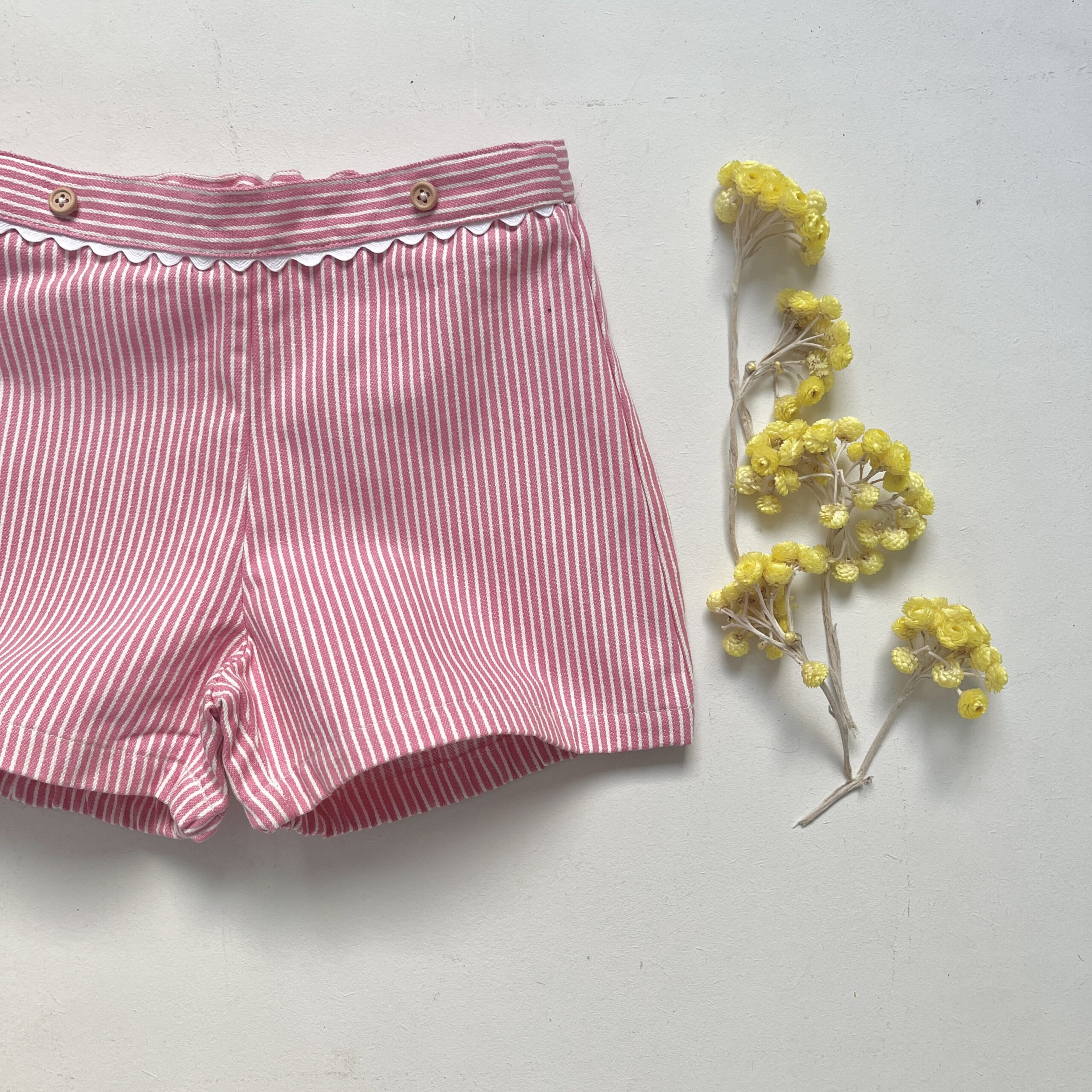 Joseph est un petit short court en denim rayé rose avec un tissu type « Oshkosh ». on adore le petit détail du croquet blanc au niveau de la ceinture. Il est élastiqué à l’arrière de la taille pour plus de confort. Les bretelles en Y amovibles, réglables et élastiquées peuvent se retirer entièrement et permettent d’imaginer différents looks pour votre bambin. Deux boutons en bois viennent habiller le devant du short. L’arrière des cuisses est élastiqué pour un effet bloomer. Intemporel, il met en valeur les petits cuissots des kids, et peut  se porter avec une paire de chaussettes hautes à la mi-saison.