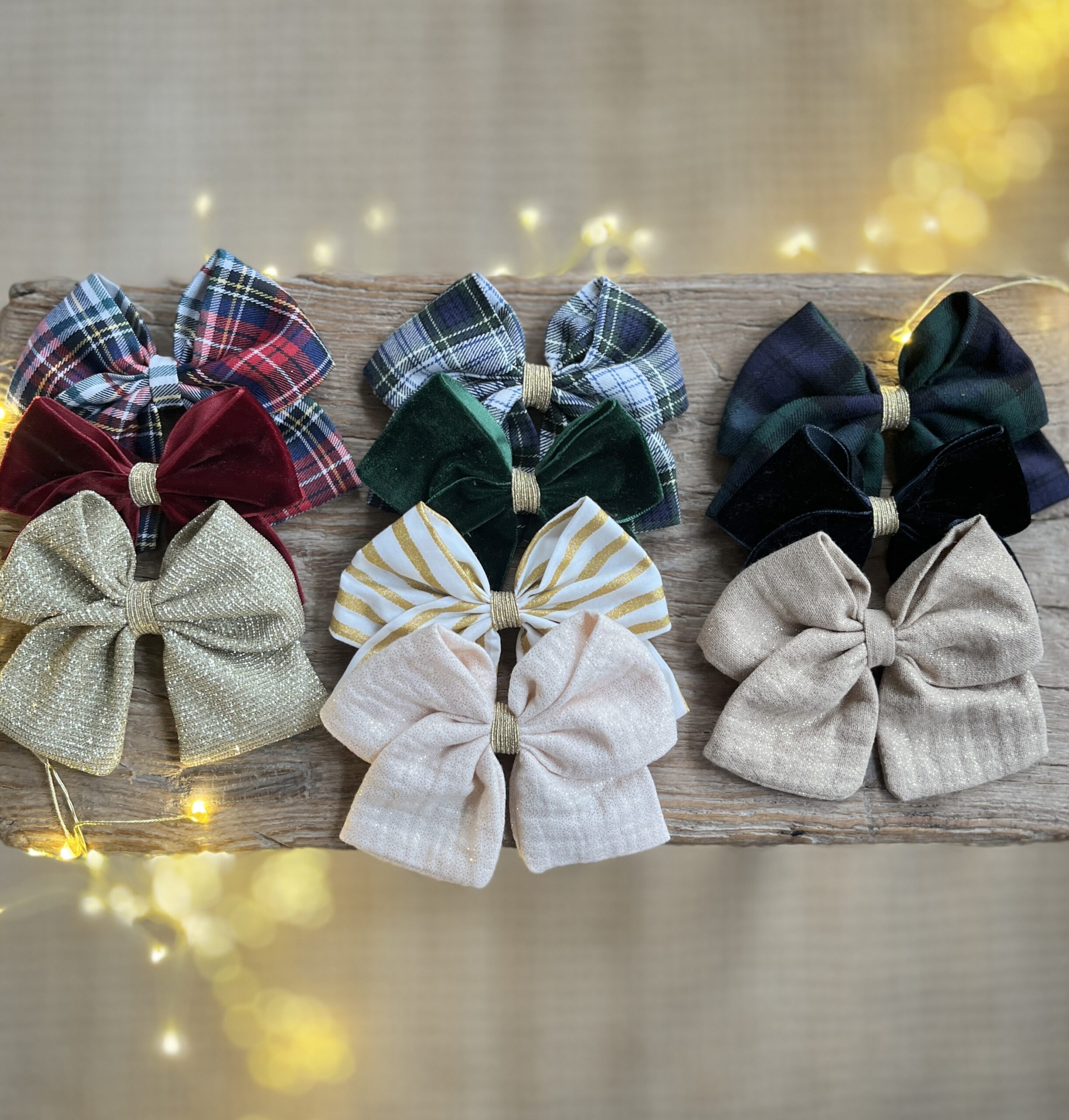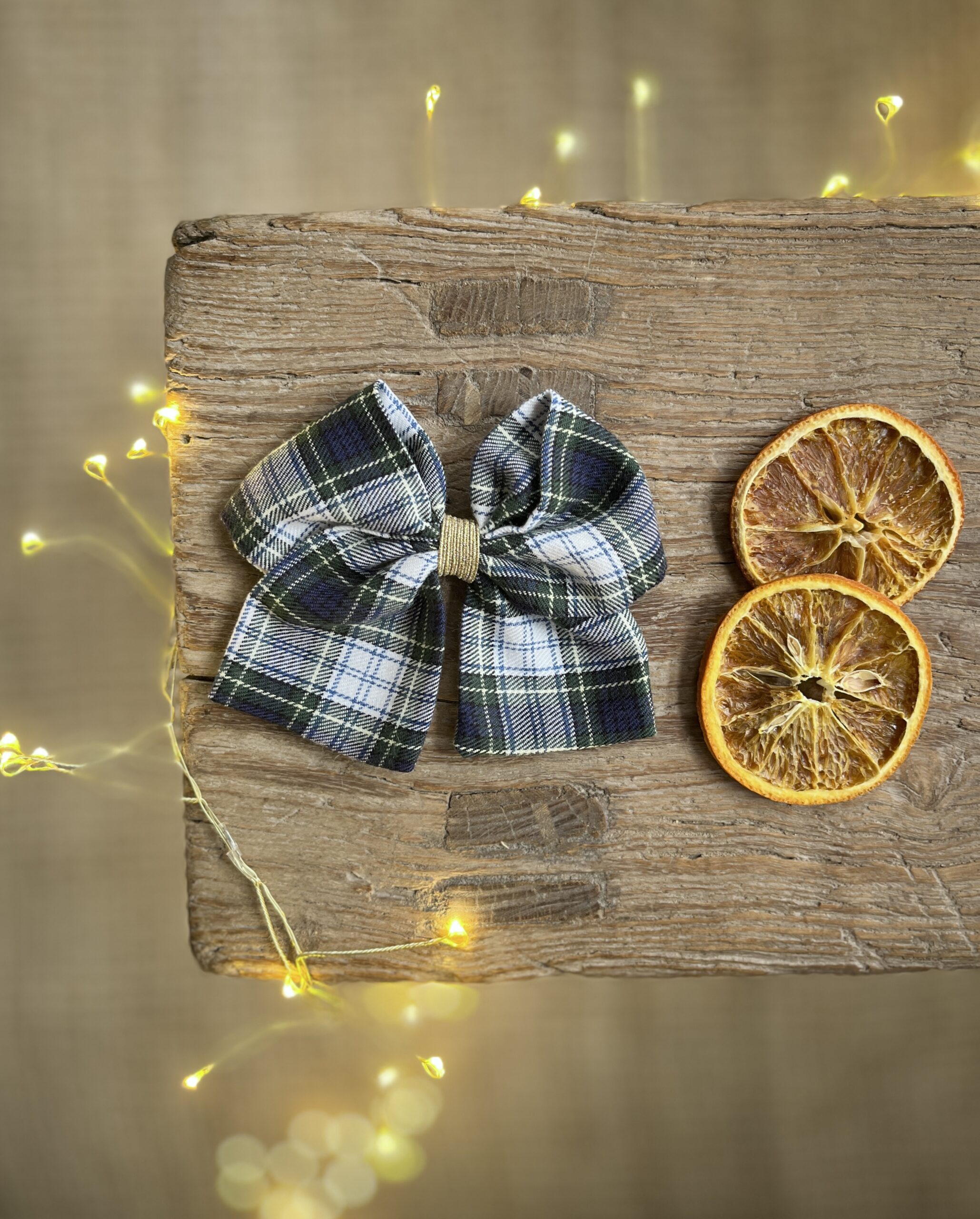 Noël: La barrette à gros nœud Brunette écossais vert et doré
