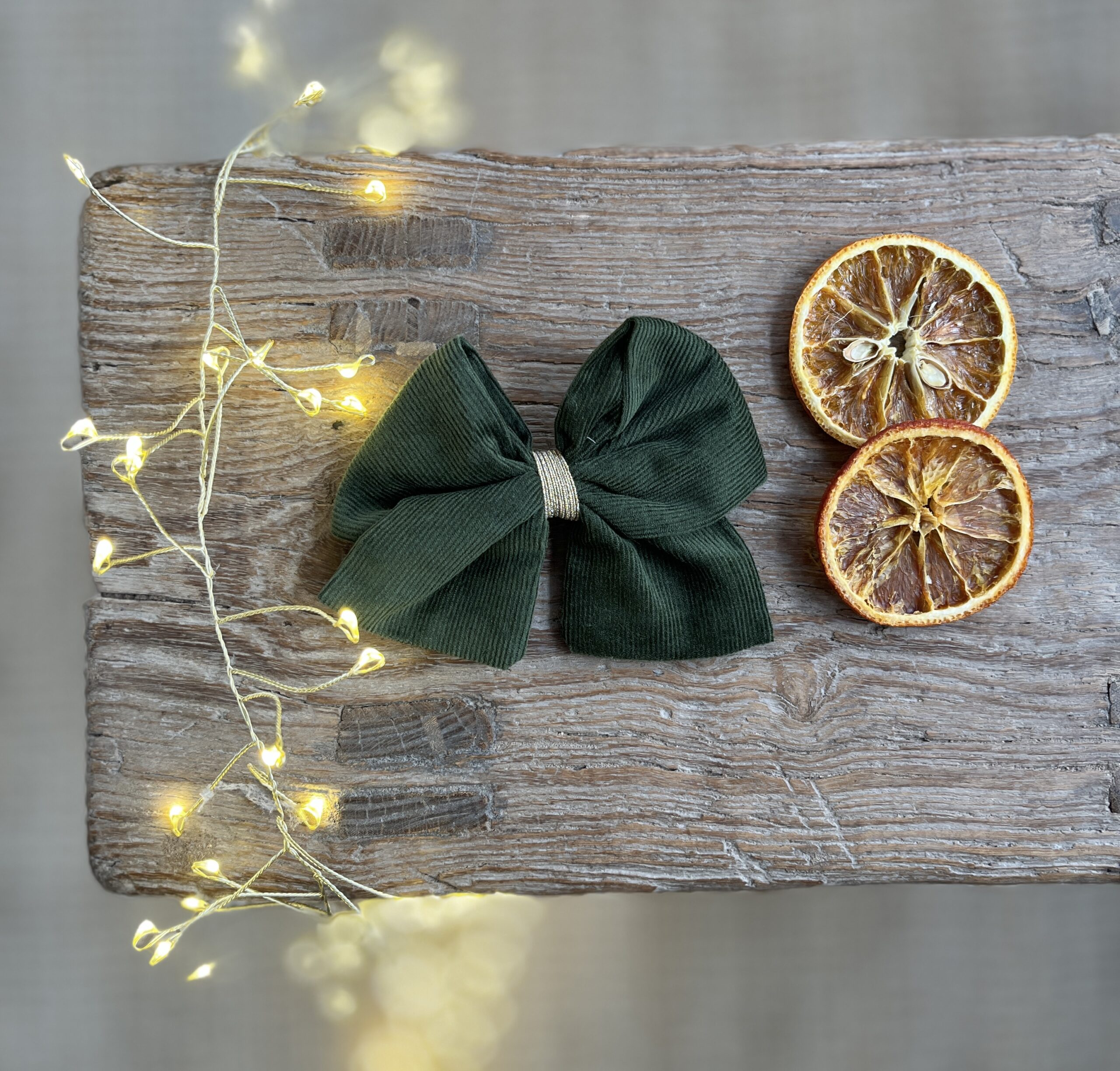 Noël: La barrette à gros nœud Brunette velours kaki et doré