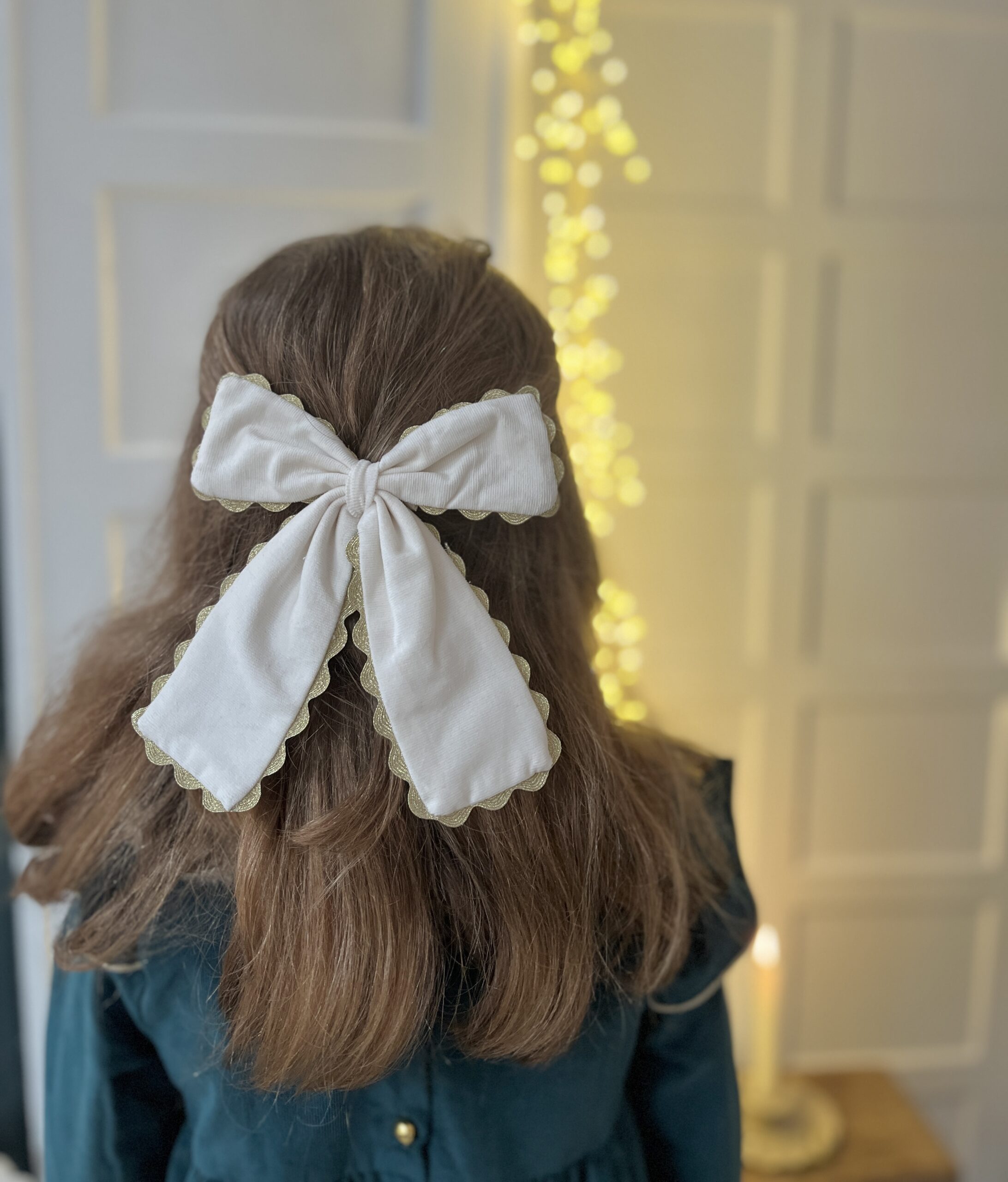 Noël: La maxi barrette à gros nœud Brunette velours écru et or