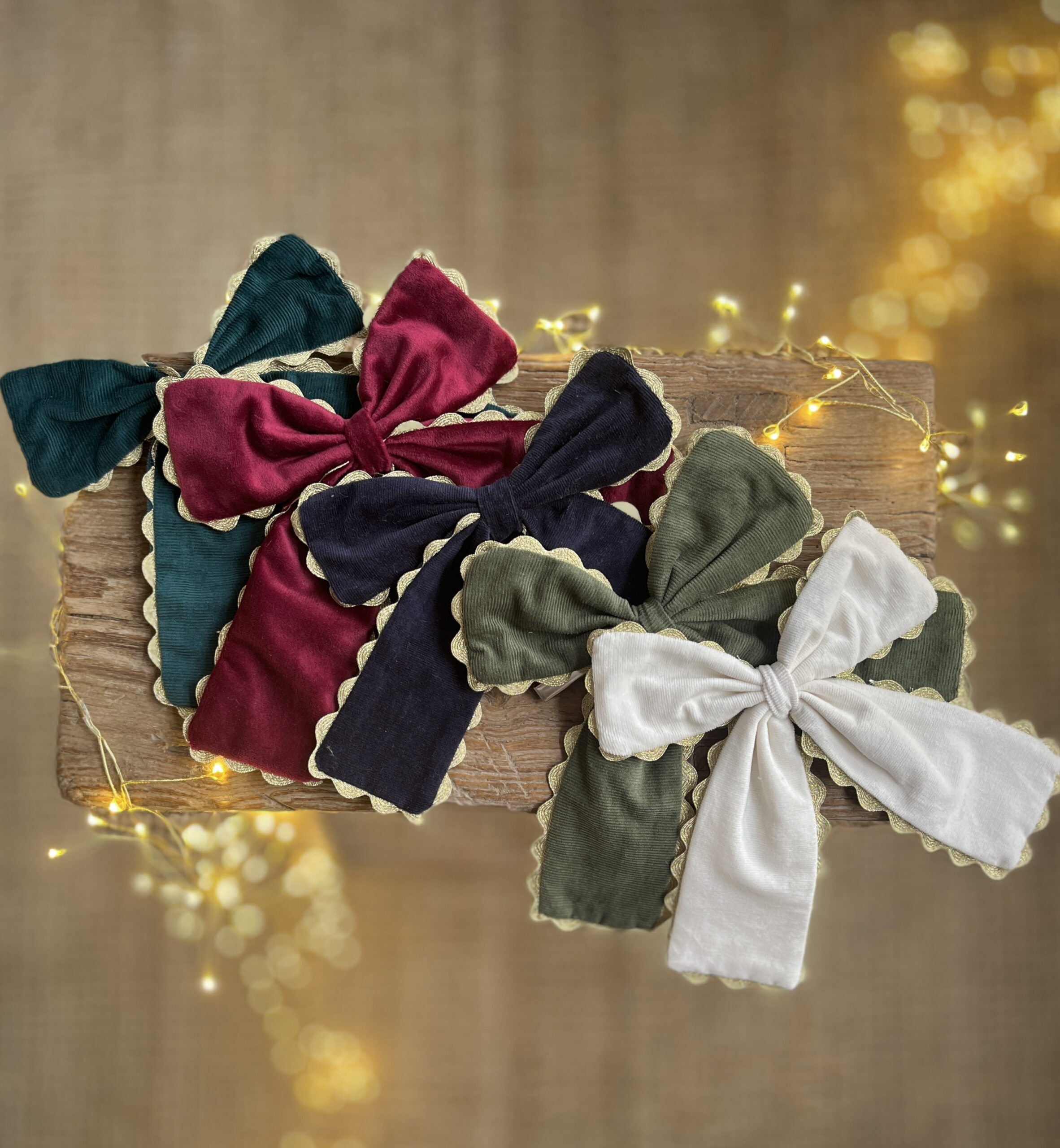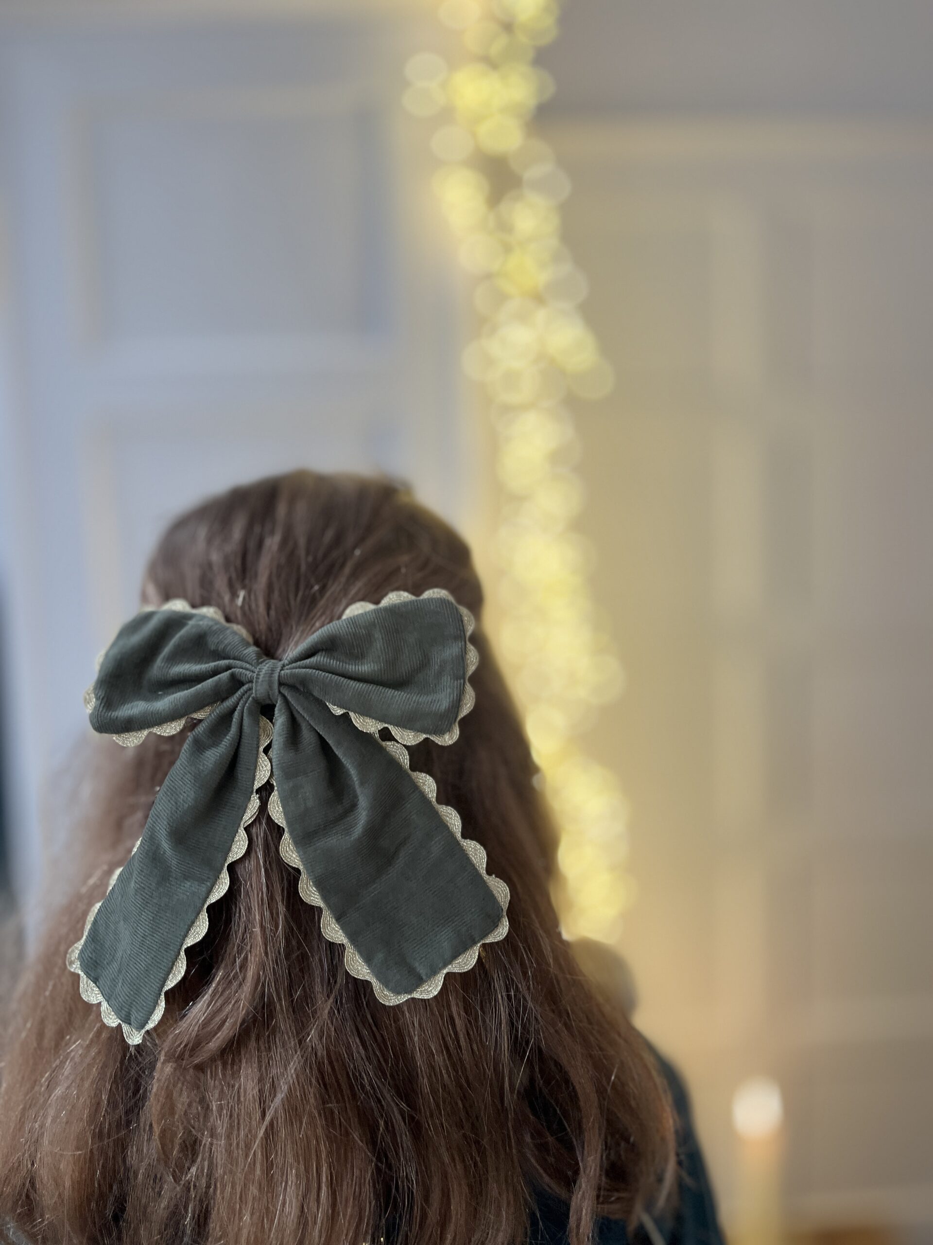 Noël: La maxi barrette à gros nœud Brunette velours kaki et or