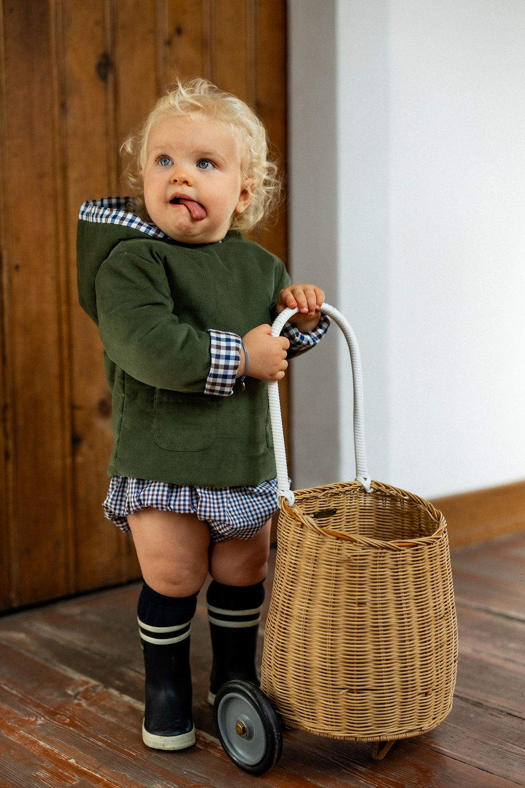 Le petit manteau parfait pour affronter la baisse des températures! Le burnous Pépino fait son entrée dans le dressing de Mes Petits Nuages. Il est développé dans un velours milleraies kaki, il a une doublure en vichy marine et marron et il est douillet à souhait. On craque pour sa capuche pointue et ses petites poches avec le rappel du vichy!